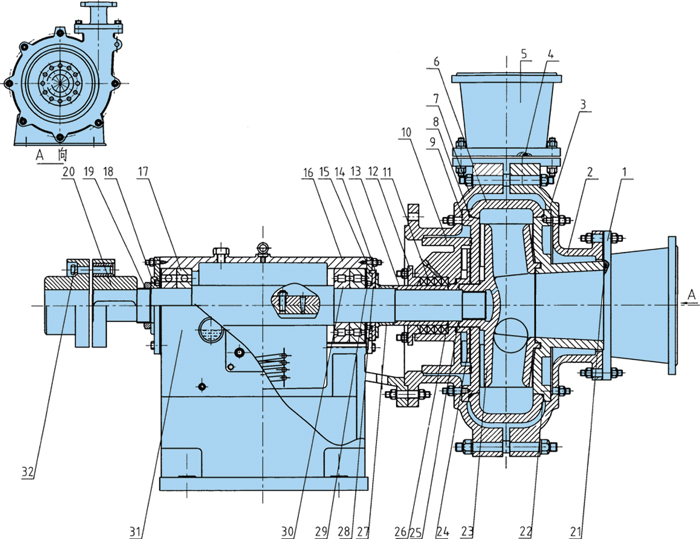 1、入口短管 2、前泵蓋 3、前護(hù)板 4、O型橡膠密封圈 5、出口短管 6、護(hù)套 7、后泵蓋 8、O型橡膠密封圈 9、后護(hù)板 10、填料箱 11、油浸石棉盤根F19 12、填料壓蓋 13、軸套 14、拆卸環(huán) 15、軸承壓蓋 16、軸承上蓋 17、向心推力球軸承 18、甩水環(huán) 19、拼冒 20、聯(lián)軸器 21、O型橡膠密封圈 22、O型橡膠密封圈 23、葉輪 24、副葉輪 25、0型橡膠密封圈 26、O型橡膠密封圈 27、調(diào)整套 28、甩水環(huán) 29、骨架油封 30、短圓柱滾子軸承 31、4號(hào)泵座 32、彈性具銷